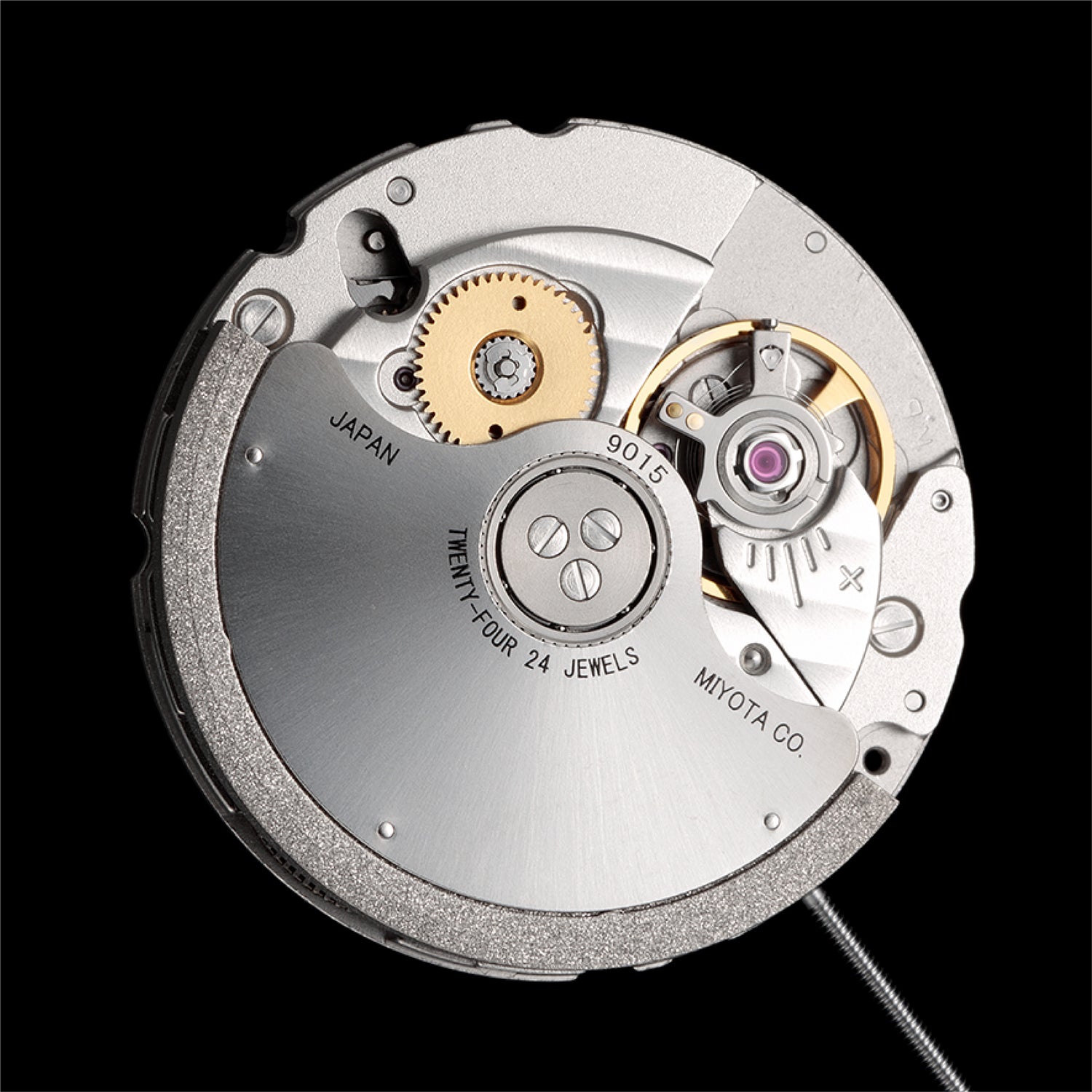 Miyota 9015, 28,800 beats, 42 hours power reserve with custom date and hacking seconds. Accuracy: ー10~+30 sec/day.
