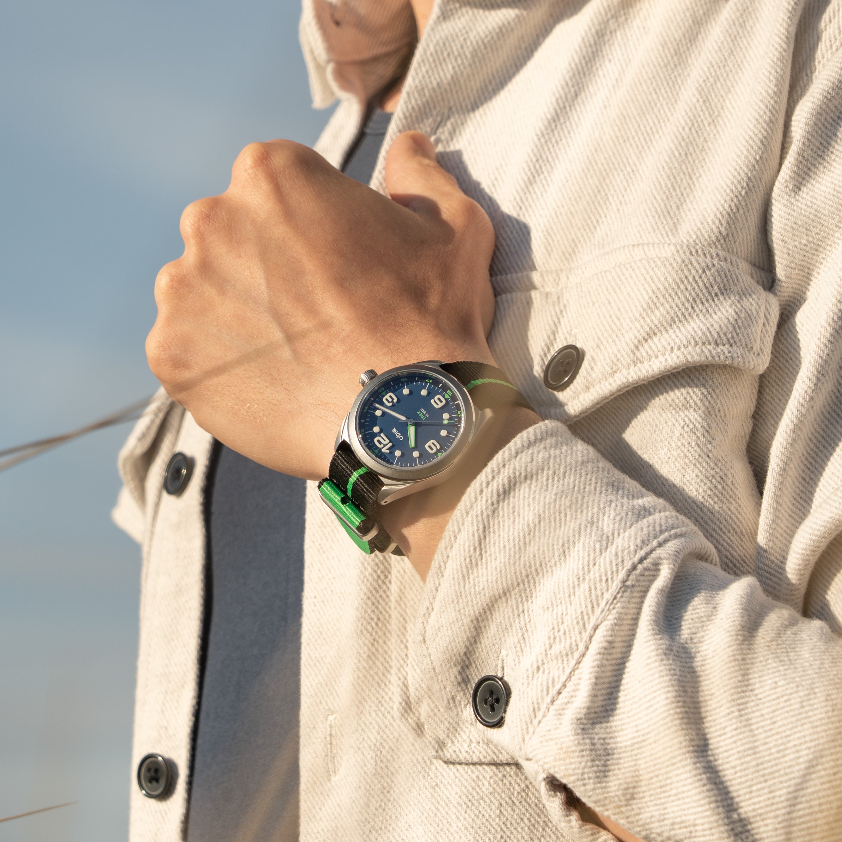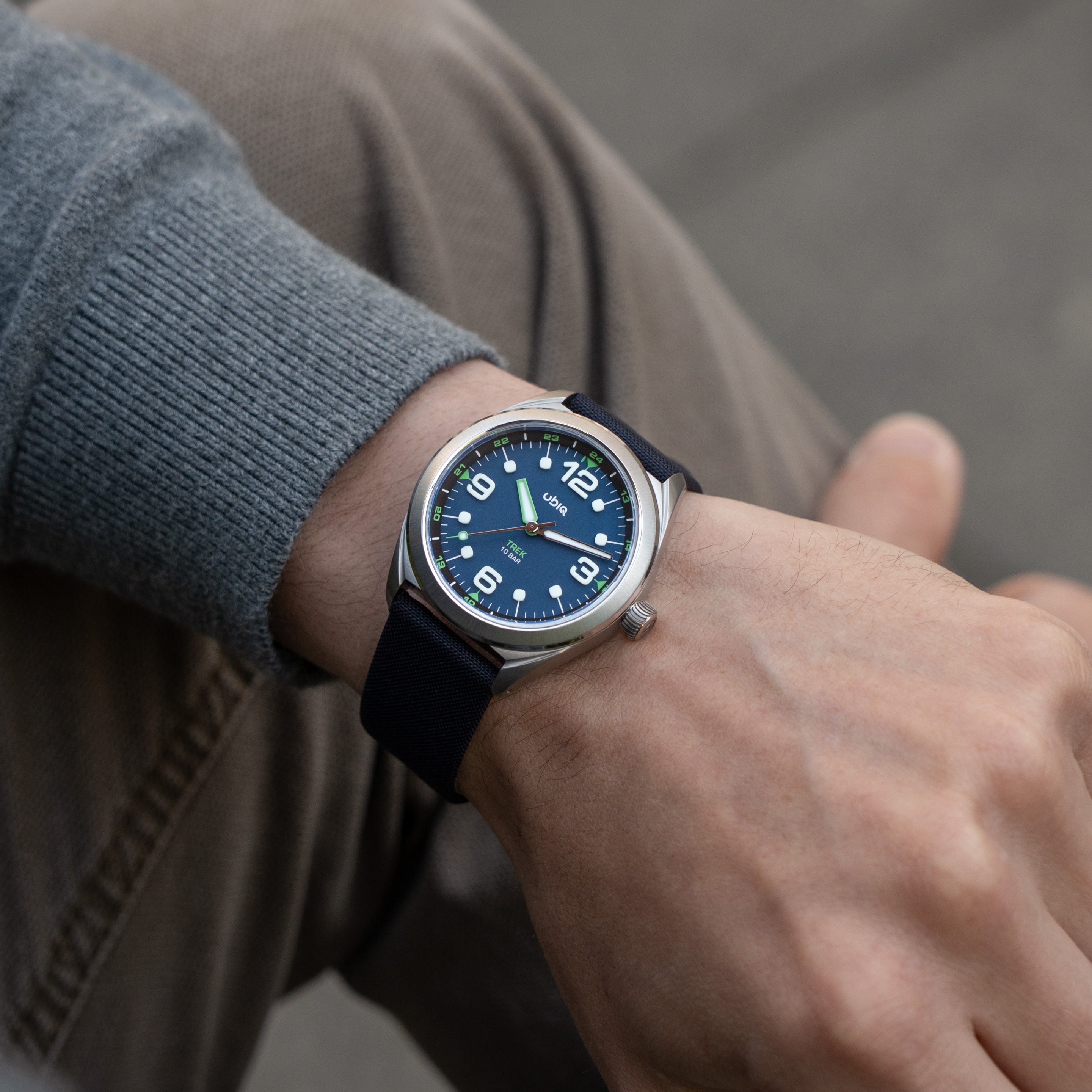 Bracelet/Strap: Marine recycled, quick-release strap and custom single pass nylon strap with 2x quick-release spring bars (optional hardened titanium, fully brushed flat multi-link bracelet with quick-release and on-the-fly micro-adjust)