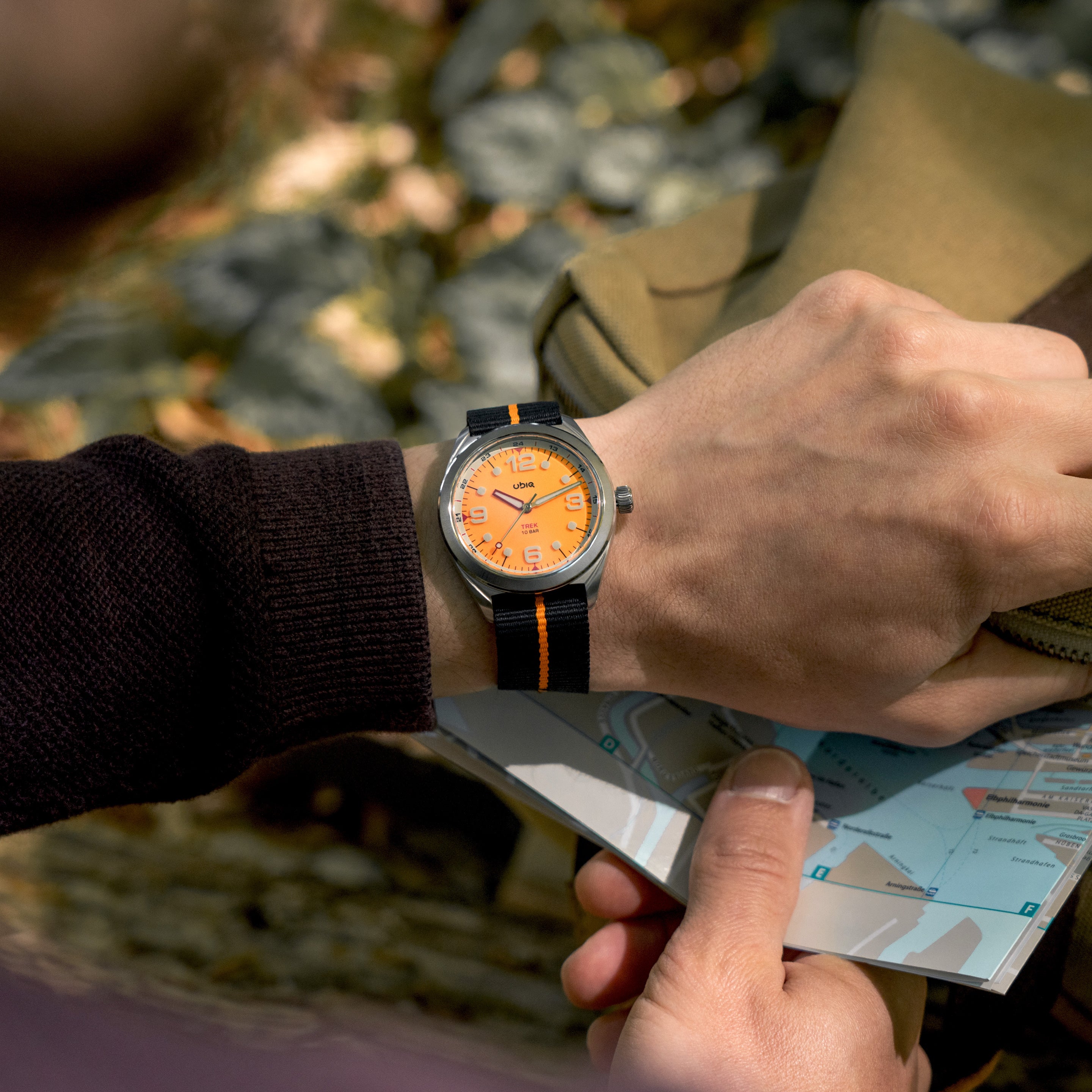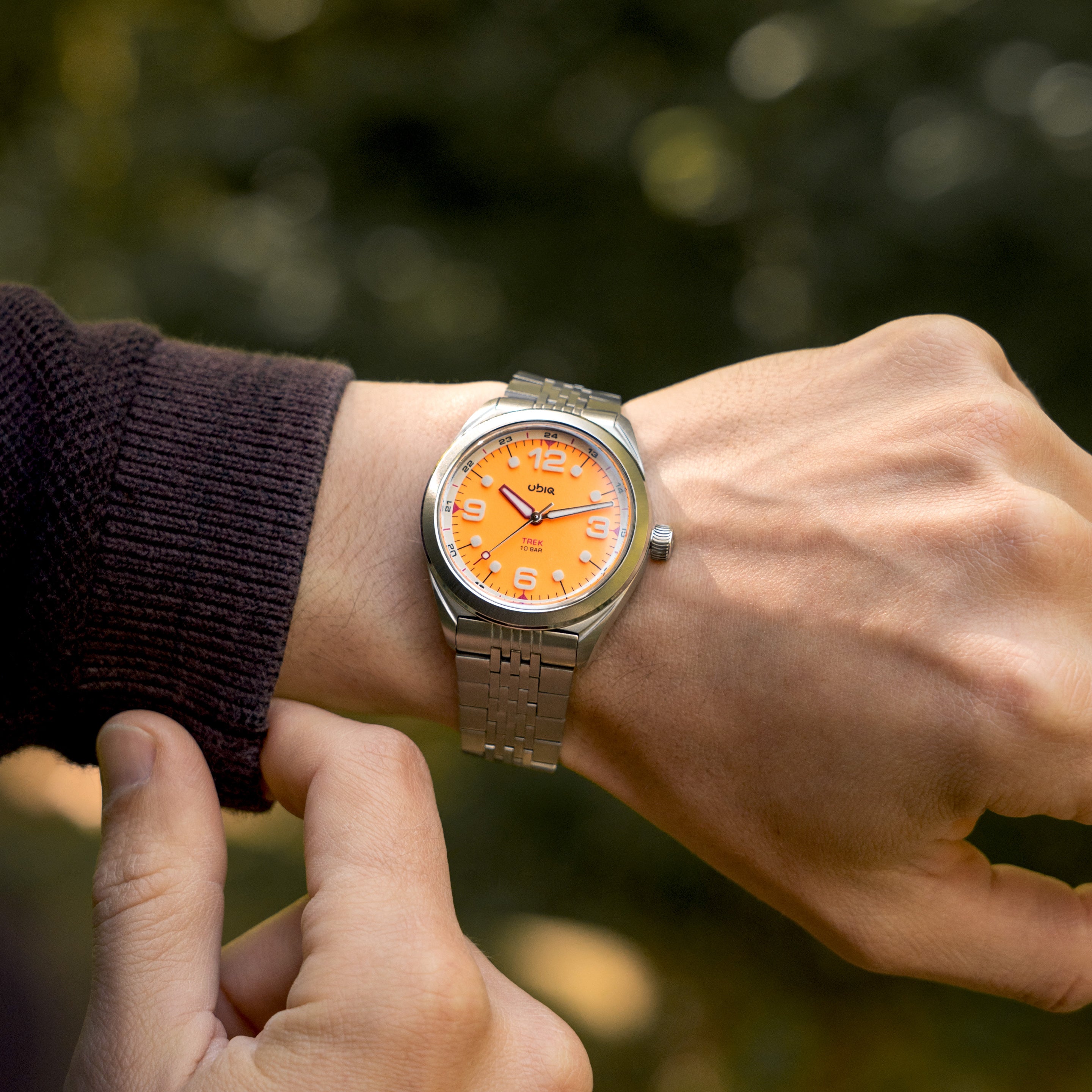 TREK ORANGEPOP stands out even more after dark with its fully lumed orange dial, accented with crisp white and striking crimson details.