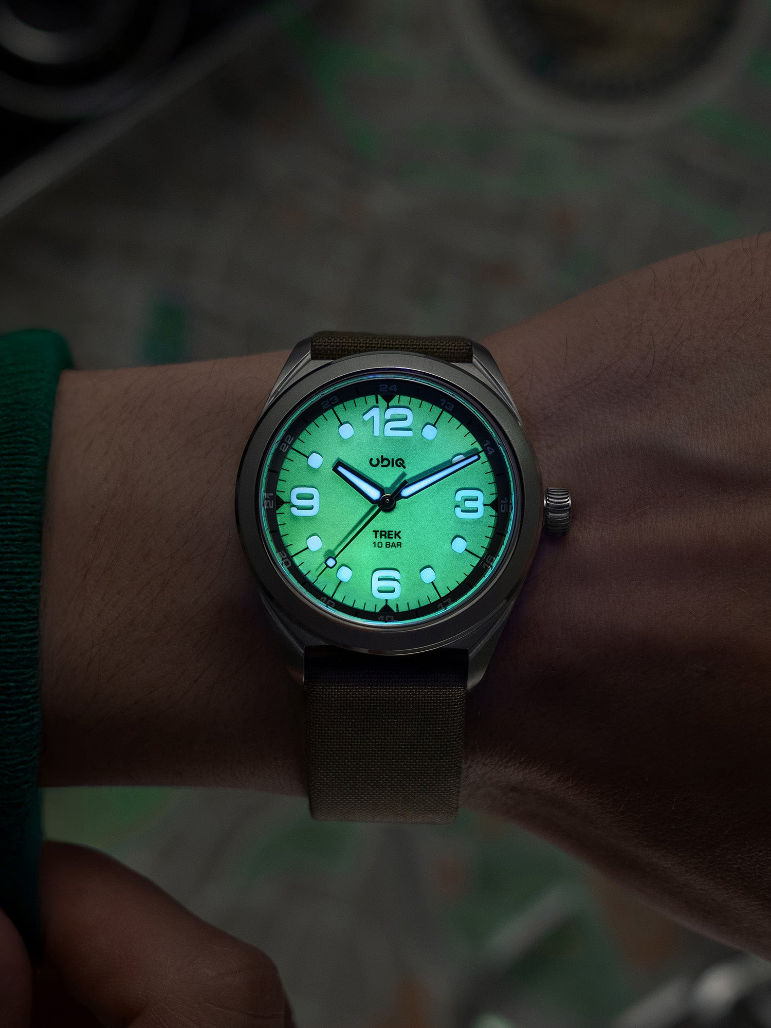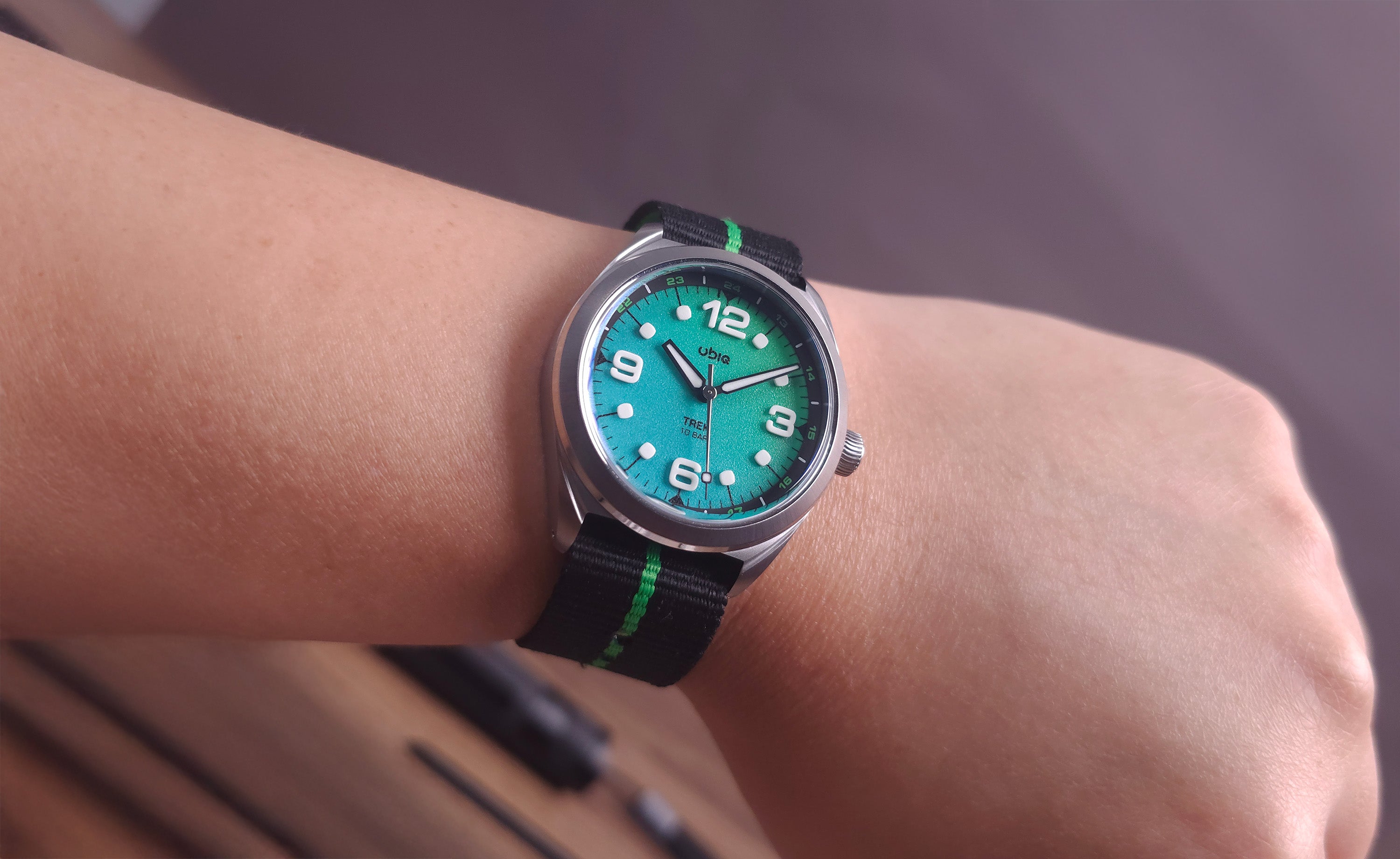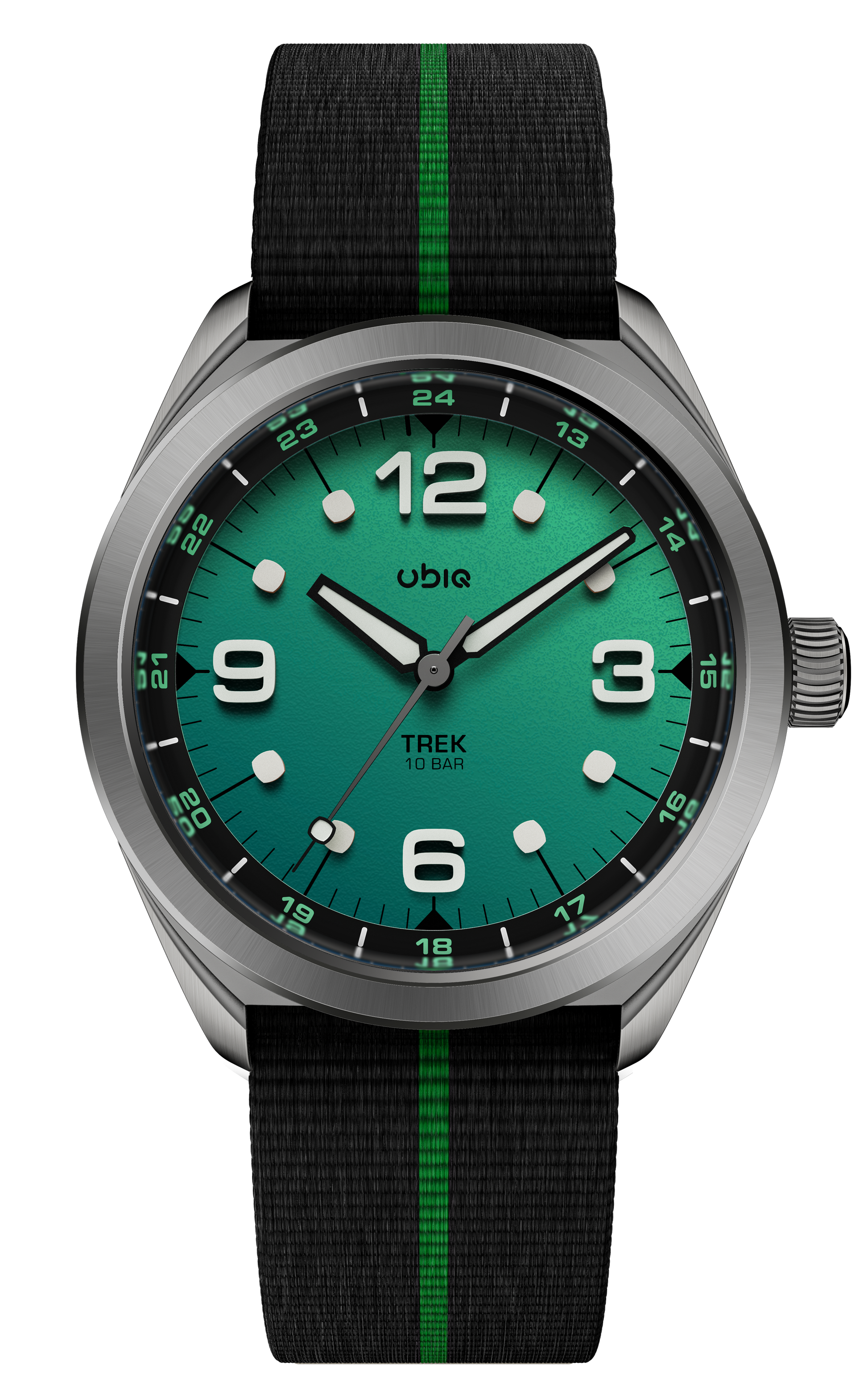 TREK REEFGLOW lights up the dark with its full lume gradient dial, paired with black accents and vivid green highlights for a bold, energetic look.