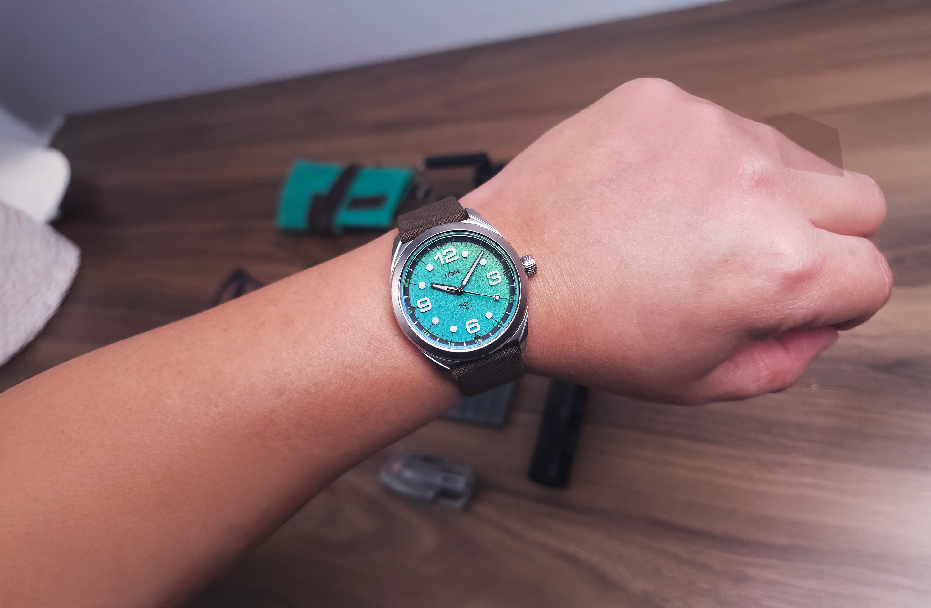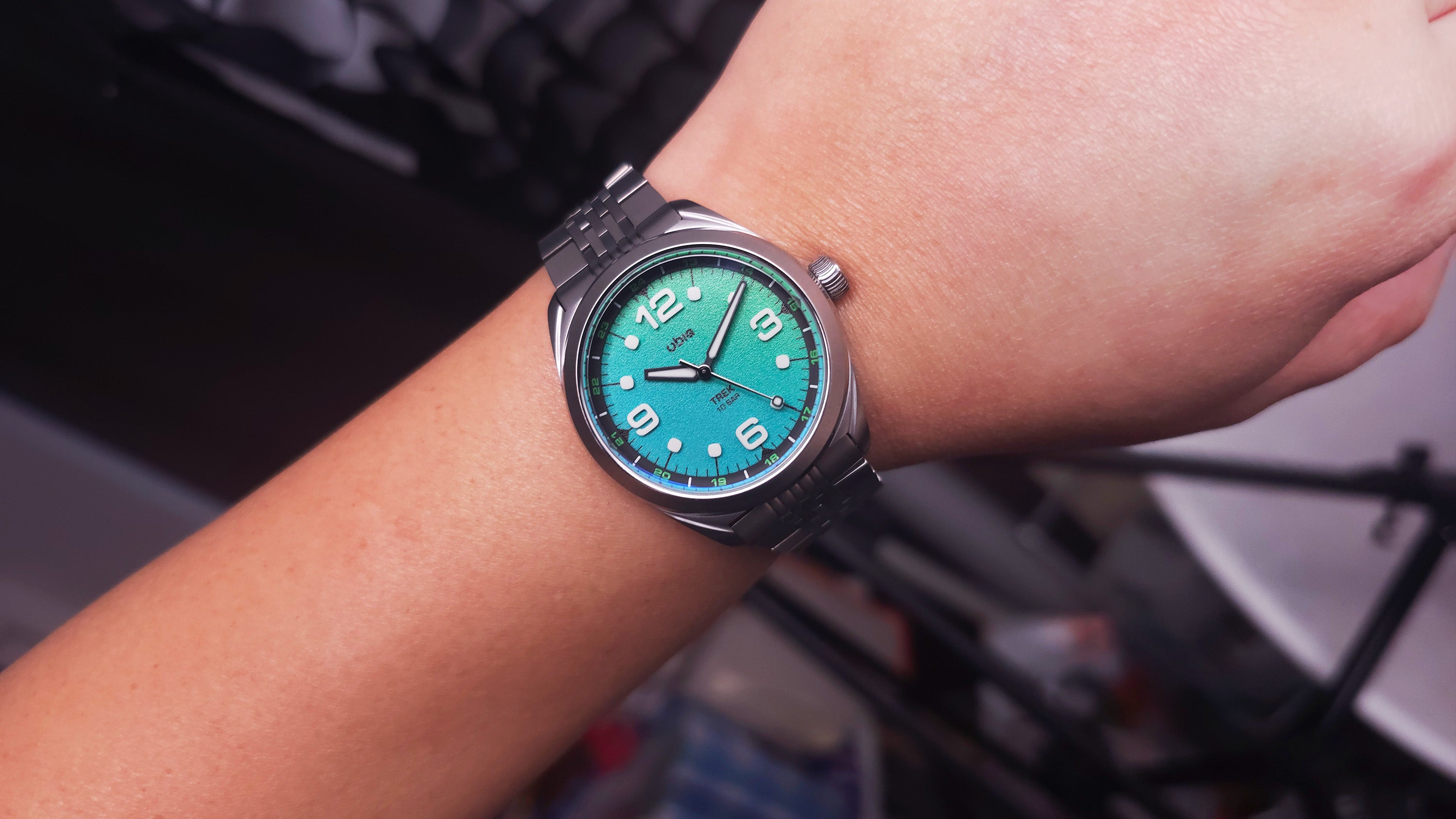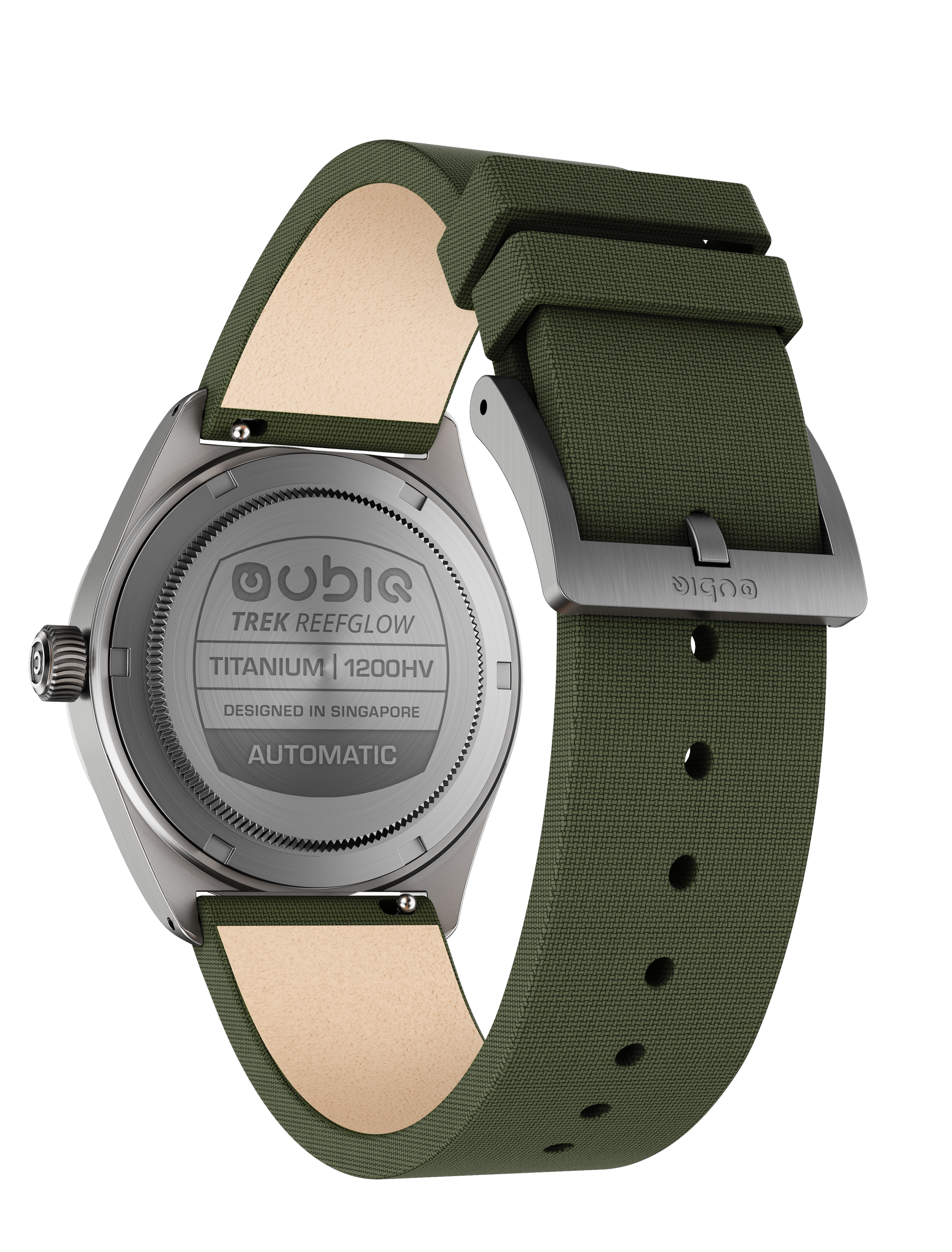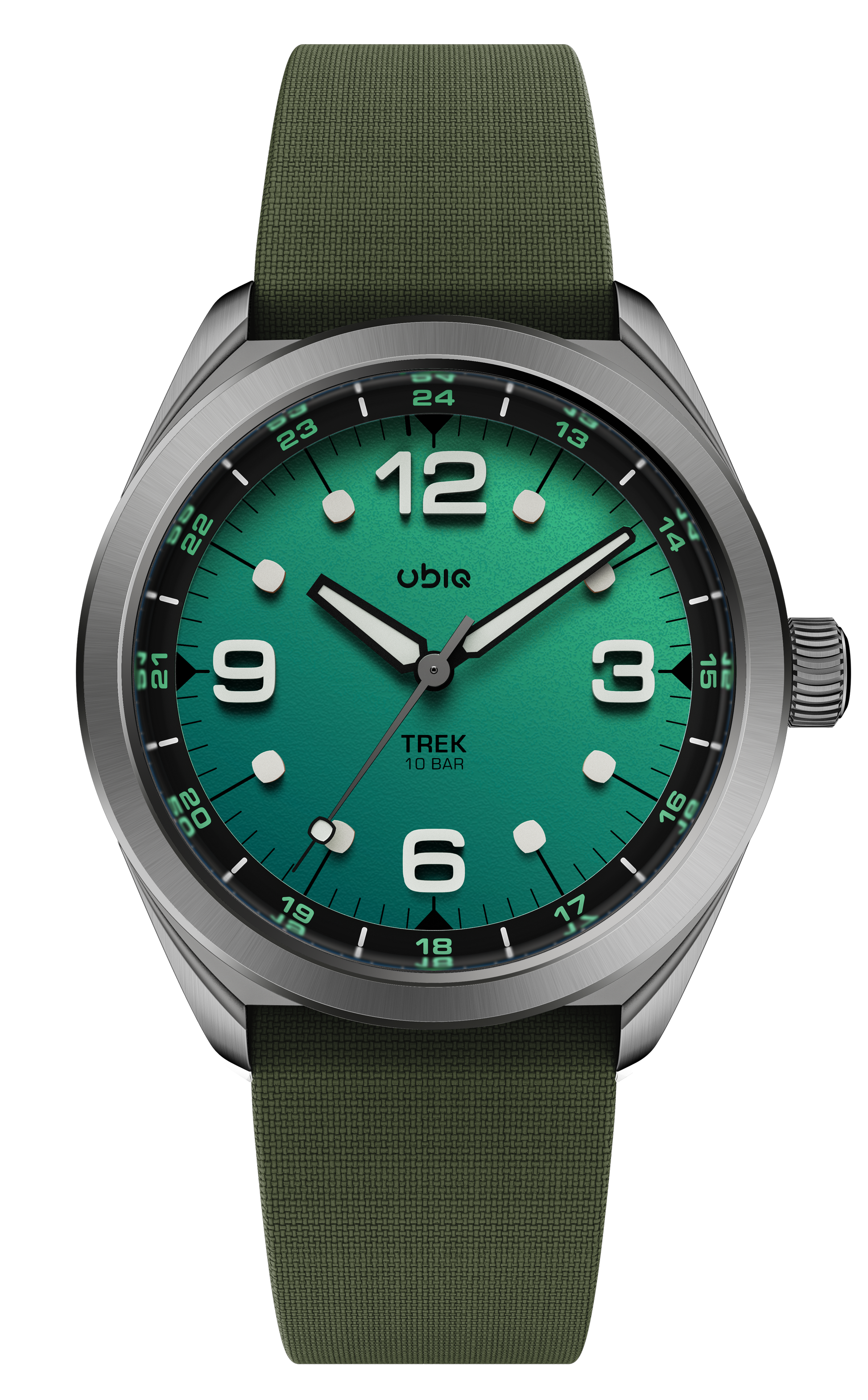 TREK REEFGLOW lights up the dark with its full lume gradient dial, paired with black accents and vivid green highlights for a bold, energetic look.